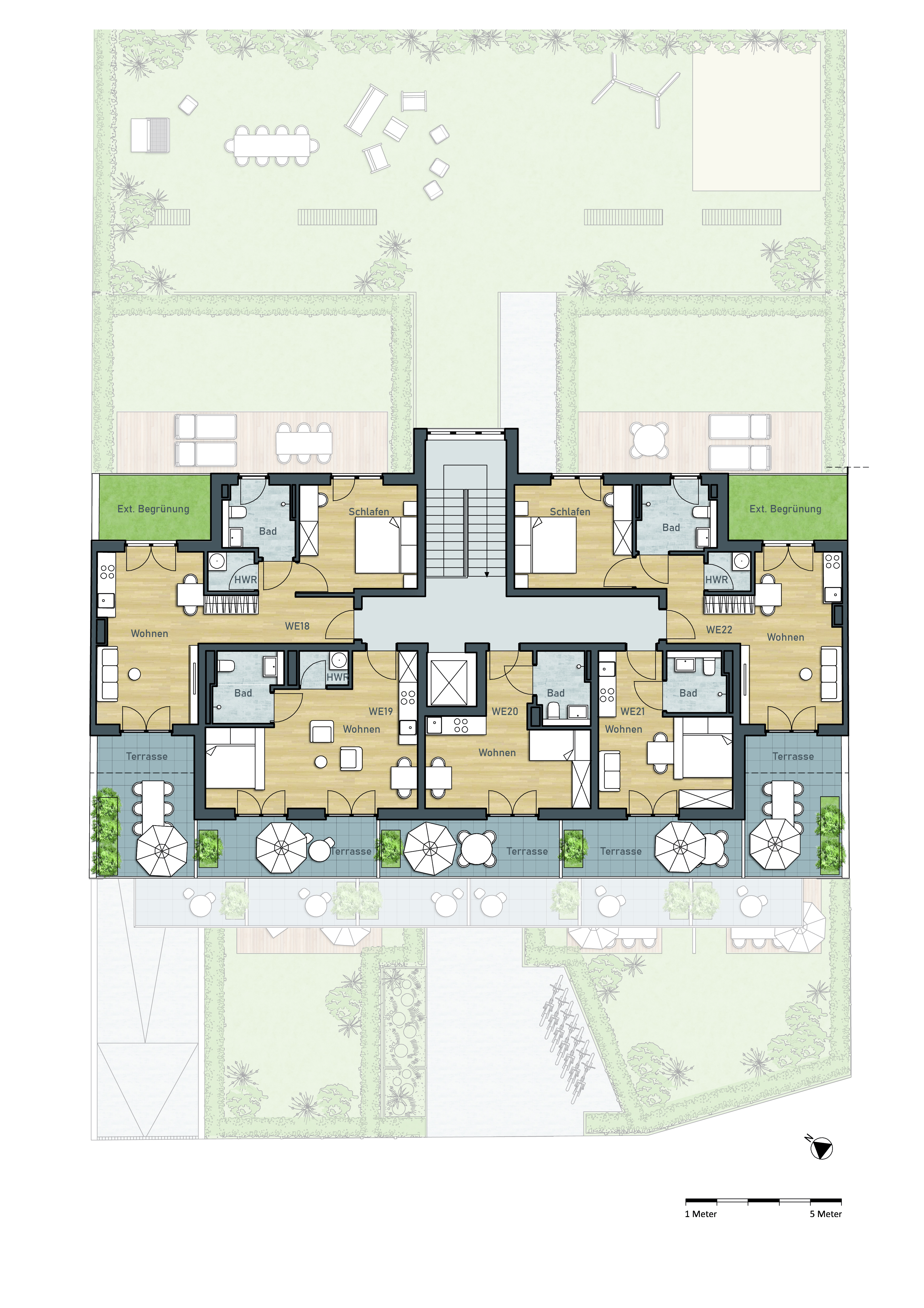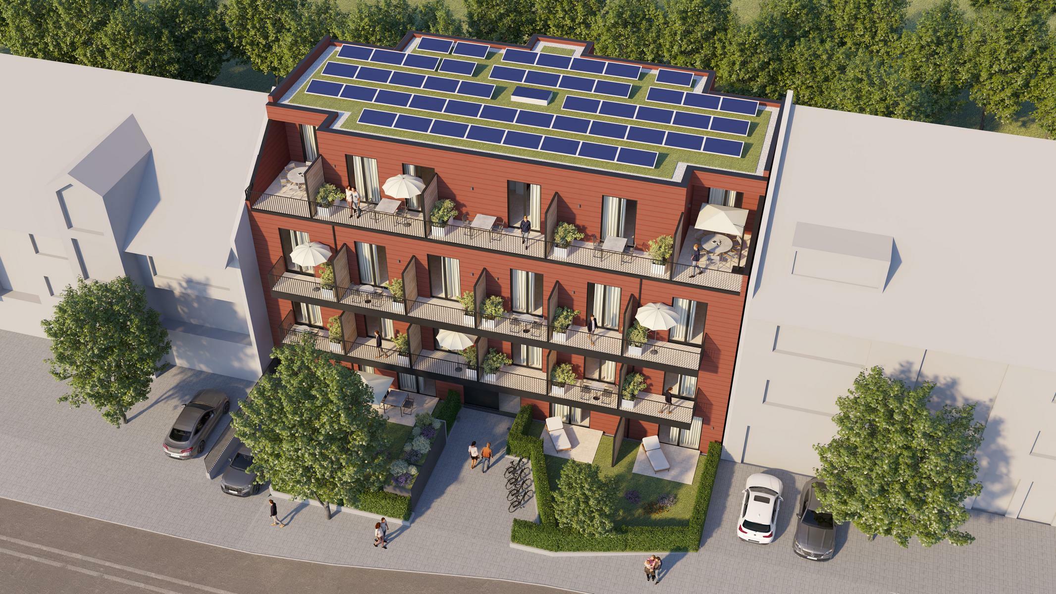 Das neue Mehrfamilienhaus wird insgesamt 22 Ein- bis Drei-Raum-Wohnungen haben, mit Wohnungsgrößen zwischen 25 und 73 m² Wohnfläche. Das Haus wird sich in einem zeitlosen, modernen Architekturstil präsentieren. Eine helle, freundliche Putzfassade wird gegliedert durch große Fensterflächen, die lichtdurchflutete Wohnungen versprechen. Anthrazitfarben Fenster prägen eine freundliche und warme Wohnatmosphäre. Die großen Fensterelemente gewährleisten im Sommer einen fließenden Übergang zwischen den Wohnräumen und den vorgelagerten Südwest-Terrassen. Die Verdunkelung und der Sonnenschutz wird durch elektrisch betätigte Aluminium-Rollläden gewährleistet. Die Deckenhöhe in den Wohnungen beträgt angenehme 3,00 m im Lichten, – ausgenommen sind die Bereiche mit abgehängten Decken (Bäder, WC’s, Hauswirtschaftsräume etc.). Zwischen den Wohnungen werden hohe Schallschutz-Standards eingehalten, so dass innerhalb der kleinen Hausgemeinschaft des Hauses ein ungestörtes Miteinander möglich ist.