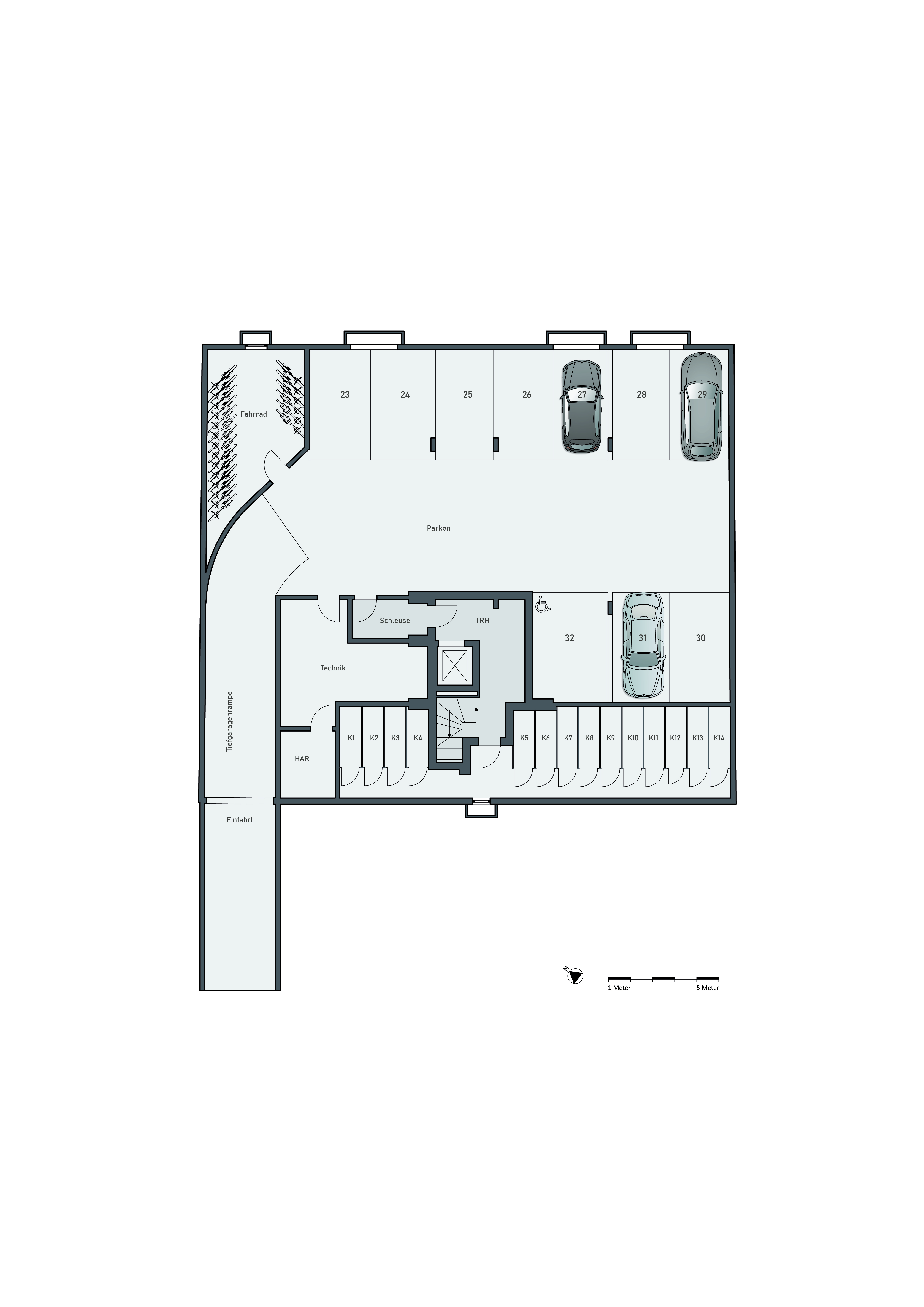 Das Kellergeschoss bietet eine Tiefgarage mit 10 Stellplätzen, einen abgeschlossenen Fahrradabstellraum und Wohnungskeller. Die Stellplätze sind für den Einbau von Fahr-zeug-spezifischen E-Ladestationen vorbereitet.