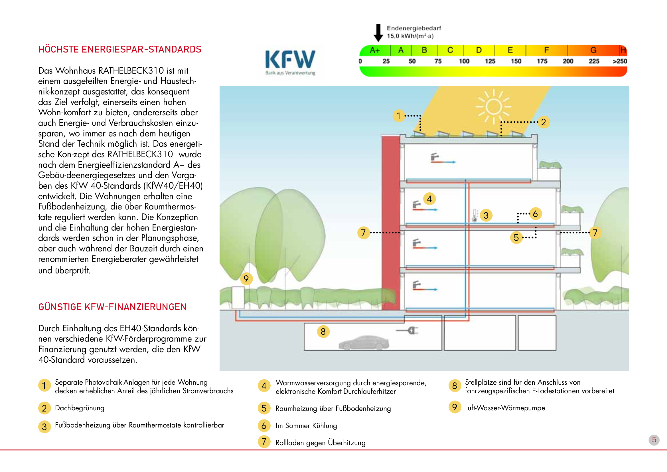 Das Wohnhaus RATHELBECK310 ist mit einem ausgefeilten Energie- und Haustechnik-konzept ausgestattet, das konsequent das Ziel verfolgt, einerseits einen hohen Wohn-komfort zu bieten, andererseits aber auch Energie- und Verbrauchskosten einzusparen, wo immer es nach dem heutigen Stand der Technik möglich ist. Das energetische Konzept des RATHELBECK310 wurde nach dem Energieeffizienzstandard A+ des Gebäu-deenergiegesetzes und den Vorgaben des KfW 40-Standards (KfW40/EH40) entwickelt. Die Wohnungen erhalten eine Fußbodenheizung, die über Raumthermostate reguliert werden kann. Die Konzeption und die Einhaltung der hohen Energiestandards werden schon in der Planungsphase, aber auch während der Bauzeit durch einen renommierten Energieberater gewährleistet und überprüft.