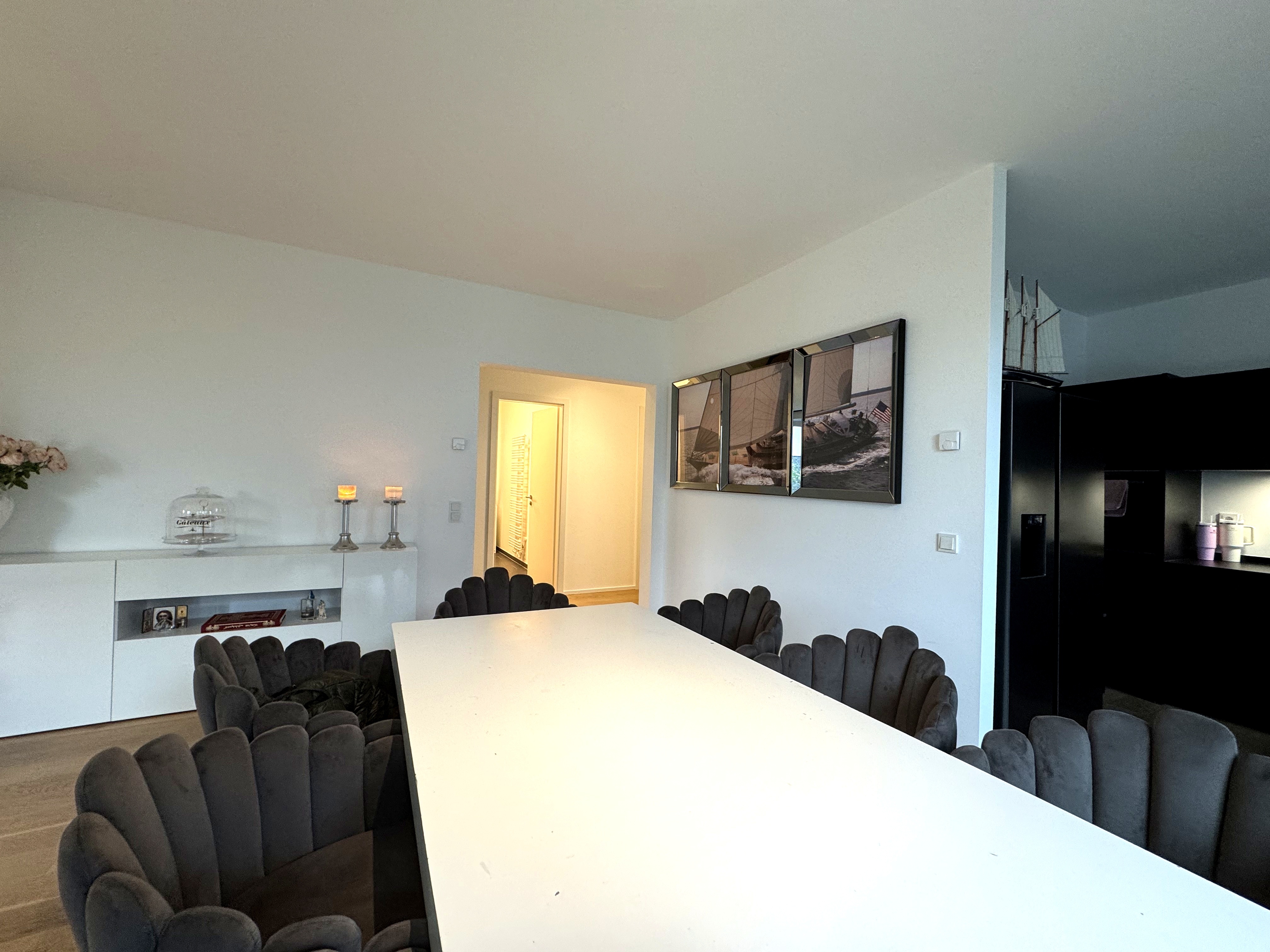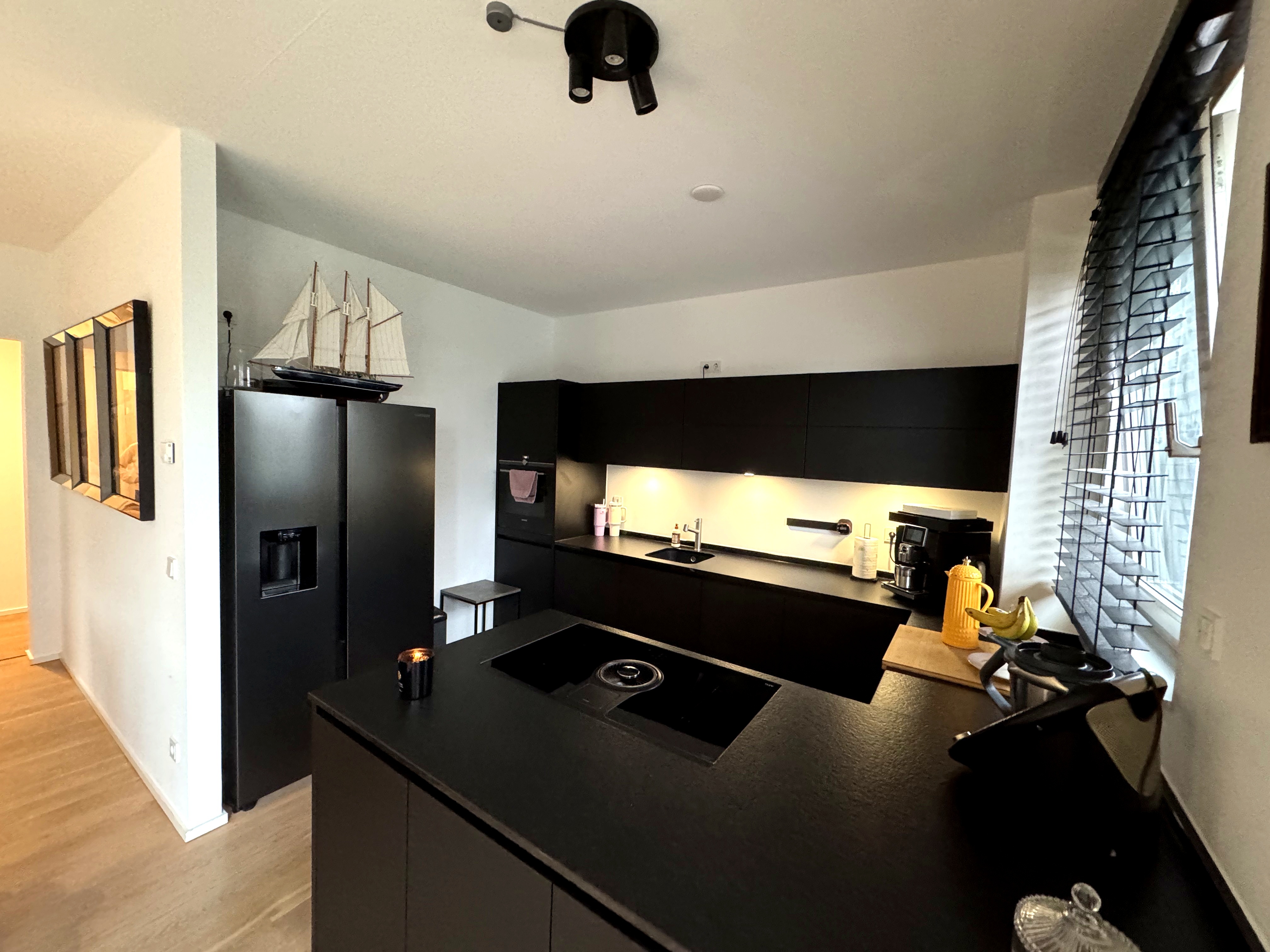 • hochwertige Einbauküche (Induktionskochfeld mit integriertem Dunstabzug, Spülmaschine, Backofen und Kühl-und Gefrierkombi (Samsung Side-by-side mit Ice Cube Maschine)