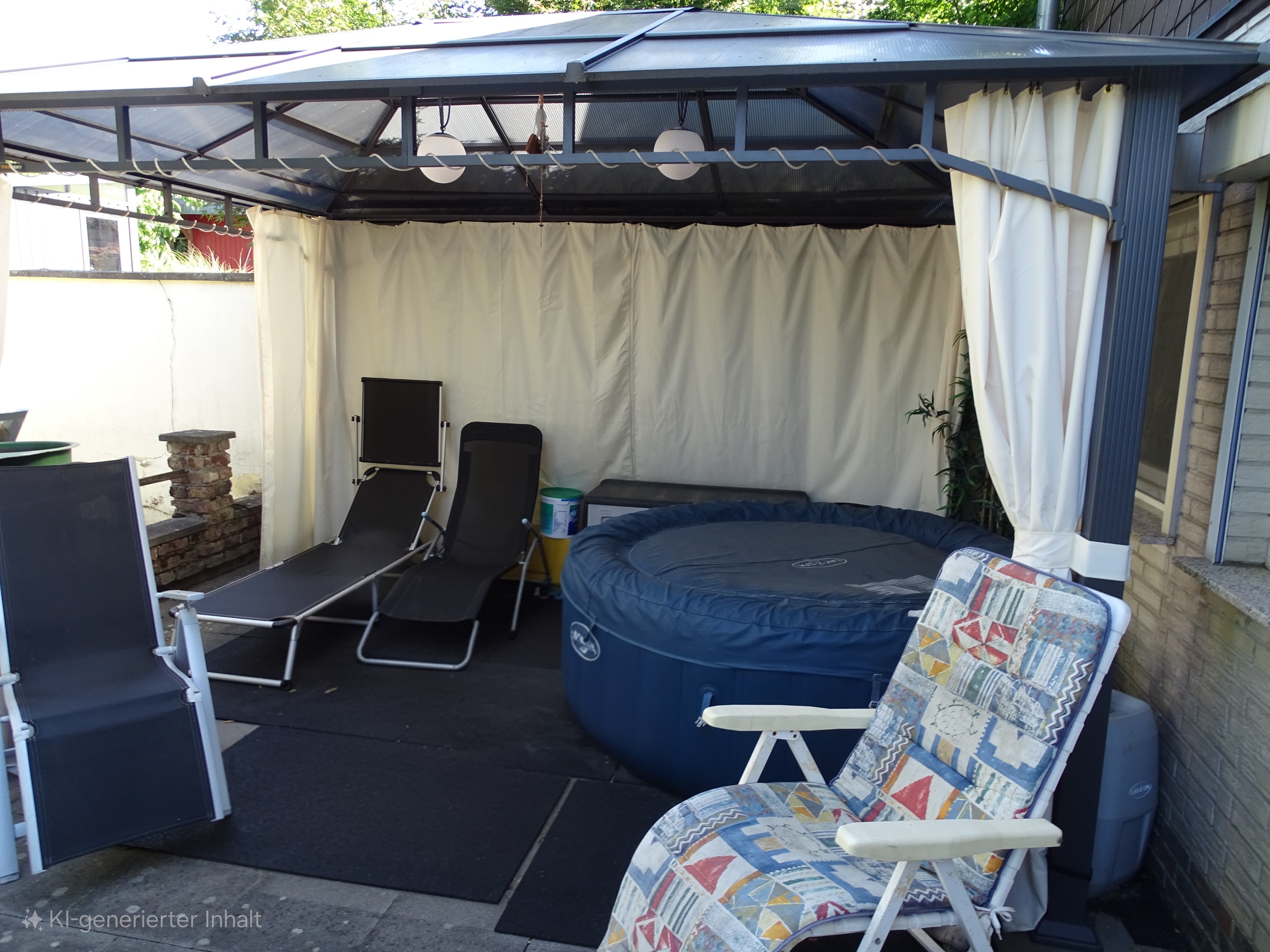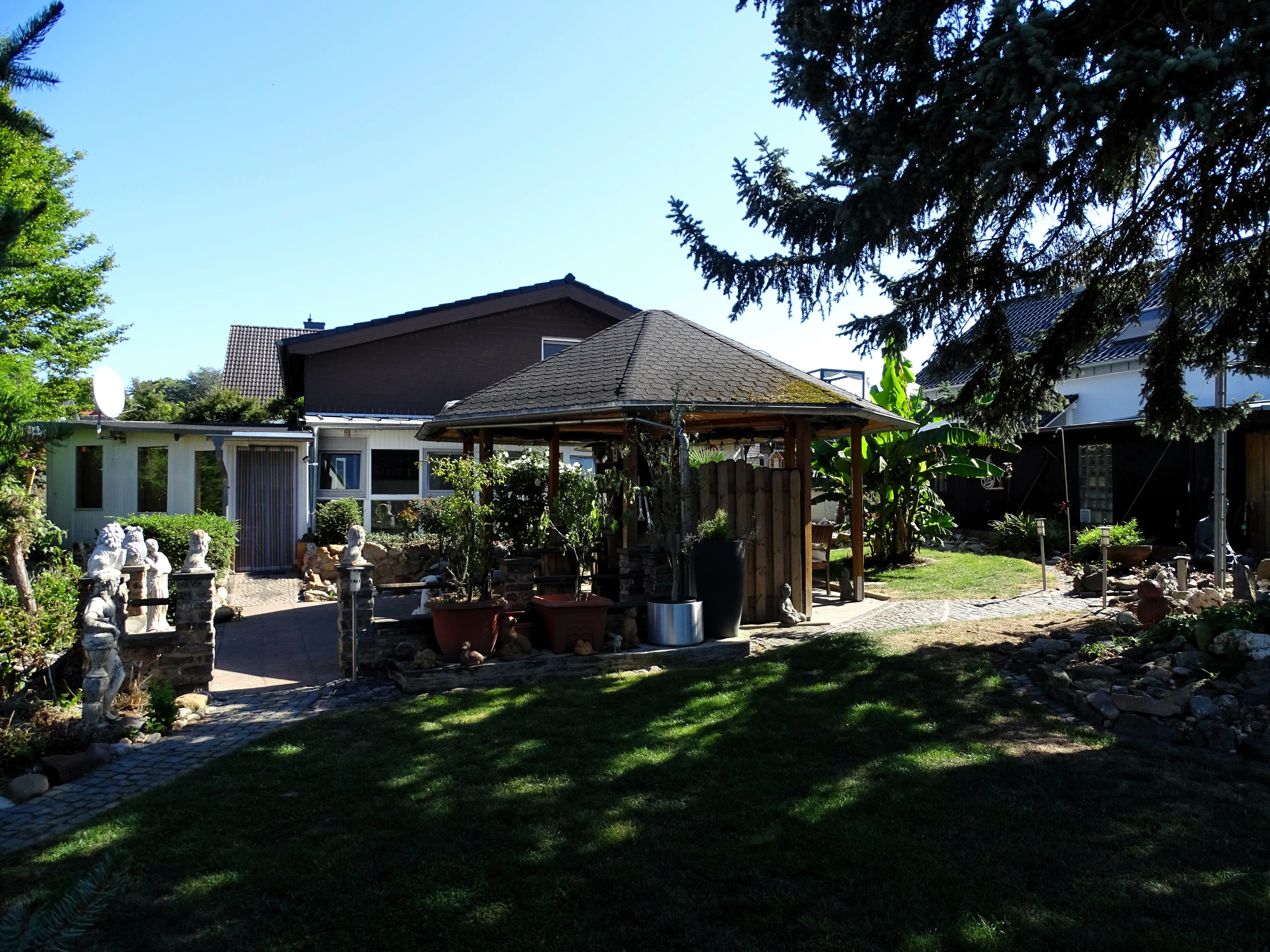 Der Außenbereich bietet mit einem überdachten Wellness-Bereich (zuletzt mit Whirlpool genutzt), einem Carport für zwei Pkw und einer langen Einfahrt weitere Attraktivität. Der Garten ist aufgrund des alten Baumbestands, eines romantischen Teichs und eines Pavillons sowohl idyllisch als auch pflegeleicht. Er bietet zudem ausreichend Platz für Kinderspielbereiche, Hundeauslauf, Gemüsegarten, einen möglichen Pool oder sogar eine flexible Bebauung.