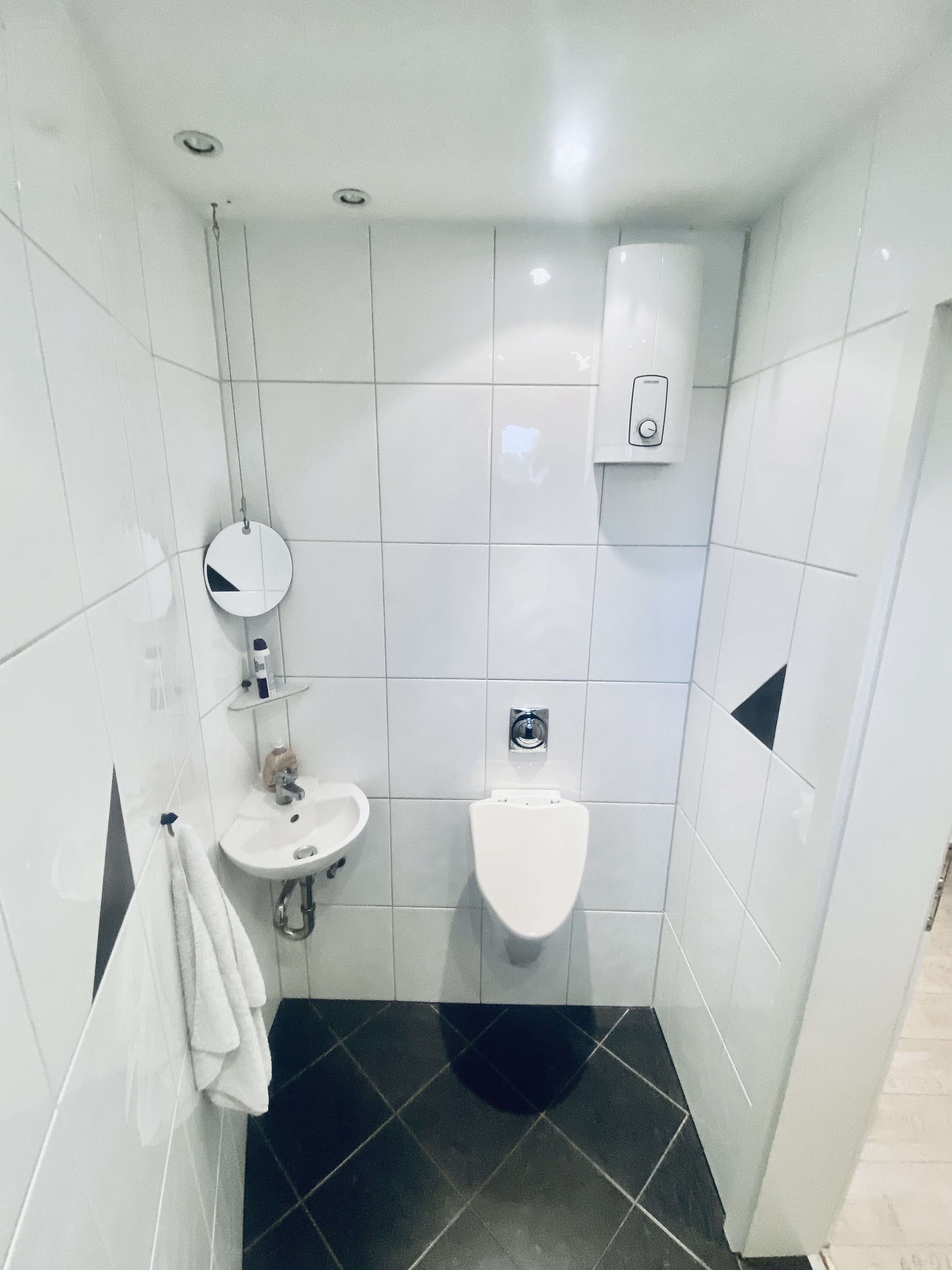 Das Tageslichtbad präsentiert sich modern und hochwertig gefliest – helle Wände, anthrazitfarbener Boden – mit Wanne und separater Runddusche, Deckenspots, Spiegelschrank und Glaswaschtisch. Ergänzt wird es durch ein separates Gäste-WC mit Fenster in klarer Schwarz-Weiß-Optik – praktisch, stilvoll und komfortabel.