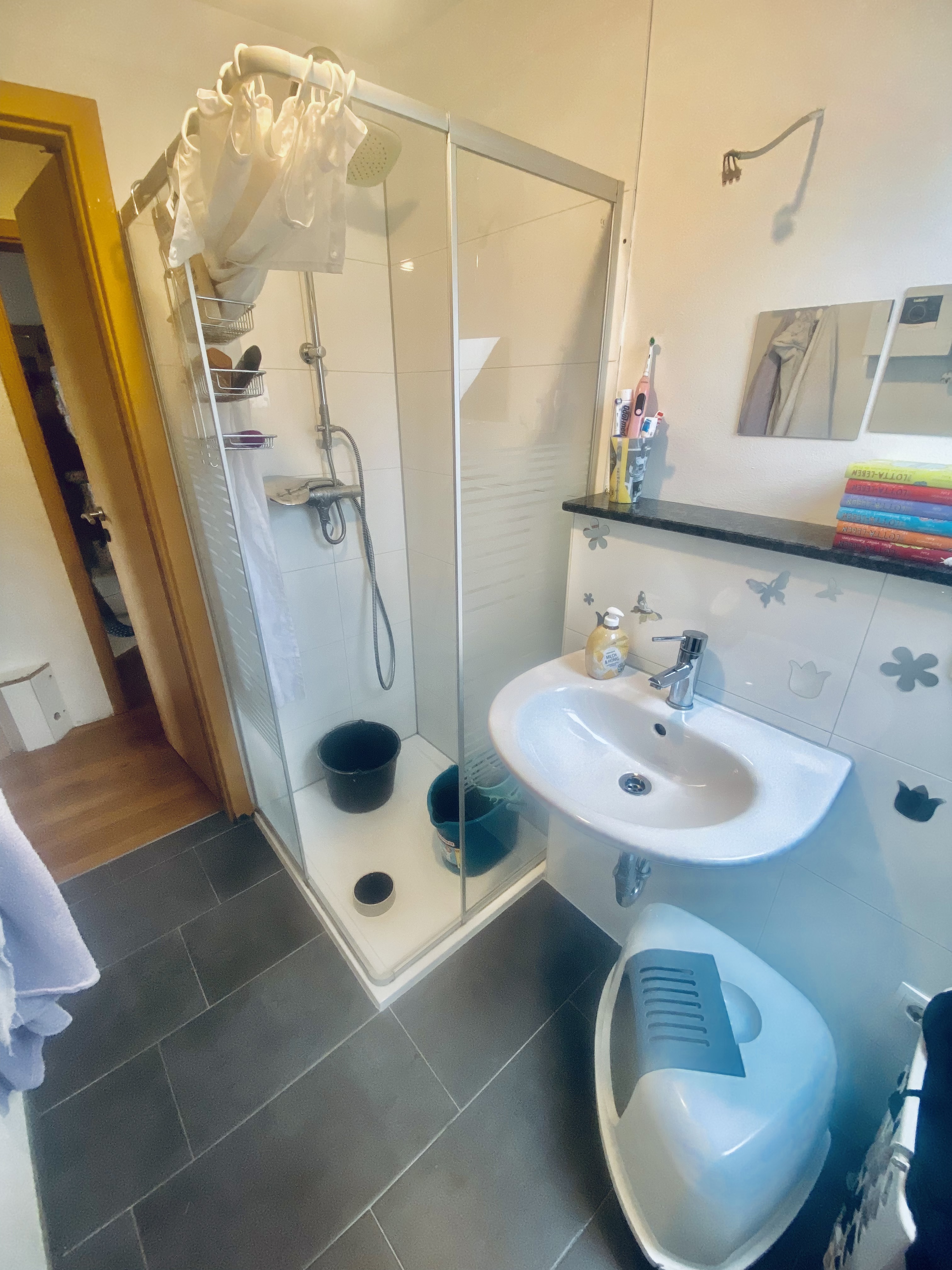 Die Böden sind pflegeleicht. Im Flur und in den Hauptzimmern wurde freundlicher Laminatboden in warmer Holzoptik verlegt, der ein angenehmes Raumgefühl vermittelt. Eines der Zimmer besitzt einen pflegeleichten, farbigen Bodenbelag (Blau), der sich ideal für Kinder- oder Hobbyräume eignet. Das Tageslichtbad punktet mit einem Oberlicht-Dachfenster zur optimalen Belüftung und ist mit einer modernen Glasduschkabine sowie neutrale und pflegeleichte Fliessen ausgestattet. Im Küchenbereich finden Sie bereits alle vorbereiteten Anschlüsse für eine Waschmaschine und einen Geschirrspüler vor, sodass Sie Ihre Wunschküche sofort installieren können. Ein eigener, abschließbarer Kellerraum rundet das Platzangebot ab und sorgt für die notwendige Ordnung und Übersicht.